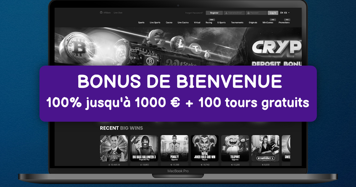 MyStake offre un bonus de bienvenue généreux de 100% jusqu'à 1000€ sur votre premier dépôt, accompagné de 100 tours gratuits sur des machines à sous sélectionnées.
